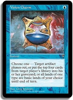 Choose one - Target artifact phases out; or put the top four cards from target player's library into his or her graveyard; or all lands of one type are basic lands of your choice until end of turn.