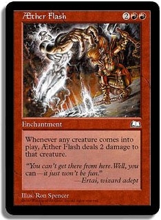 Whenever any creature comes into play, Aether Flash deals 2 damage to that creature.
