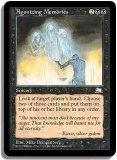 Look at target player's hand. Choose two of those cards and put them on top of his or her library in any order.
