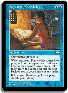 Cumulative upkeep: <1>. When Ancestral Knowledge comes into play, look at the top ten cards of your library, then remove any number of them from the game and put the rest back on top of your library in any order. If Ancestral Knowledge leaves play, shuffle your library.