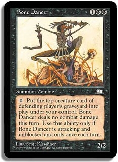 <0>: Put the top creature card of defending player's graveyard into play under your control. Bone Dancer deals no combat damage this turn. Use this ability only if Bone Dancer is attacking and unblocked and only once each turn.