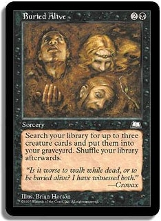 Search your library for up to three creature cards and put them into your graveyard. Shuffle your library afterwards.