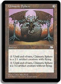 <2>: Until end of turn, Chimeric Sphere is a 2/1 artifact creature with flying. <2>: Until end of turn, Chimeric Sphere is a 3/2 artifact creature without flying.