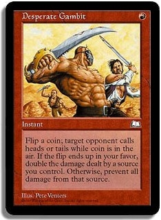 Flip a coin; target opponent calls head or tails while coins is in the air. If the flip ends up in your favor, double the damage dealt by a source you control. Otherwise, prevent all damage from that source.