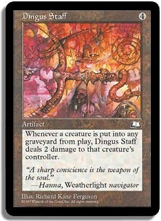 Whenever a creature is put into any graveyard from play, Dingus Staff deals 2 damage to that creature's controller.