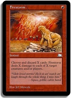 <Choose and discard X cards>: Firestorm deals X damage to each of X target creatures and/or players.