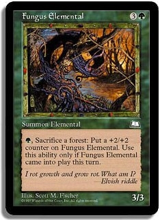 <G>: Sacrifice a forest. Put a +2/+2 counter on Fungus Elemental. Use this ablity only on the turn Fungus elemental came into play.
