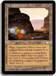 When Gemstone Mine comes into play, put three mining counters on it. <T,Remove a mining counter from Gemstone Mine>: Add one mana of any color to your mana pool. If there are no mining counters on Gemstone Mine, bury it.