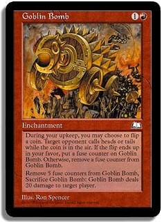 During your upkeep, you may choose to flip a coin. Target opponent calls heads or tails while the coin is in the air. If the flip ends up in your favor, put a fuse counter on Goblin Bomb. Otherwise, remove a fuse counter from Goblin Bomb. <Remove 5 fuse counters from Goblin Bomb, Sacrifice Goblin Bomb>: Goblin Bomb deals 20 damage to target player.