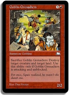<Sacrifice Goblin Grenadiers>: Destroy target creature and target land. Use this ability only if Goblin Grenadiers is attacking and unblocked