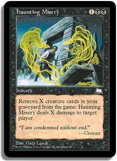 <Remove X target creature cards in your graveyard from the game>: Haunting Misery deals X damage to target player.