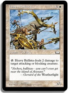 <T>: Heavy Ballista deals 2 damage to target attacking or blocking creature.