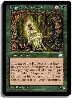 If Liege of the Hollows is put into any graveyard from play, each player may pay any amount of mana to put that number of Squirrel tokens into play under his or her control. Treat those tokens as 1/1 green creatures.