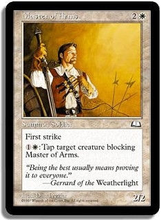 First Strike. <1W>: Tap target creature blocking Master of Arms.