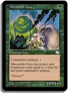 Cumulative upkeep: <2>. Mwonvuli Ooze has power and toughness each equal to 1 plus its last paid cumulative upkeep.