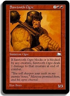 If Sawtooth Ogre blocks or is blocked by any creature, Sawtooth Ogre deals 1 damage to that creature at end of combat.