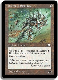 <T>: Put a -1/-1 counter on Serrated Biskelion and a -1/-1 counter on target creature.