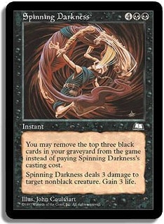 You may remove the top three black cards in your graveyard from the game instead of paying Spinning Darkness's casting cost. Spinning Darkness deals 3 damage to target nonblack creature. Gain 3 life.