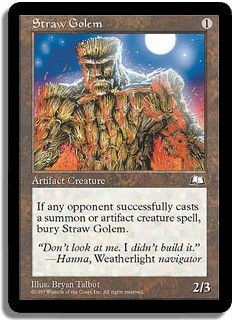 If any opponent succesfully casts a summon or artifact creature spell, bury Straw Golem.