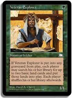 If Veteran Explorer is put into any graveyard from play, each player may search his or her library for up to two basic land cards and put those lands into play. Each player shuffles his or her library afterwards.