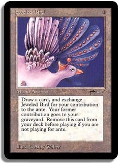 Draw a card, and exchange Jeweled Bird for your contribution to the ante. Your former contribution goes to your graveyard. Remove this card from your deck before playing if you are not playing for ante.