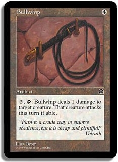 <2,T>: Bullwhip deals 1 damage to target creature. That creature attacks this turn if able.