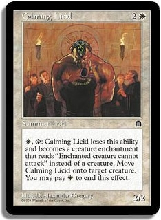 <W,T>: Calming Licid loses this ability and becomes a creature enchantment that reads "Enchanted creature cannot attack" instead of a creature. Move Calming Licid onto target creature. You may pay <W> to end this effect.
