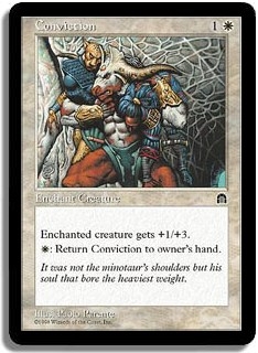 Enchanted creature gets +1/+3. <W>: Return Conviction to owner's hand.