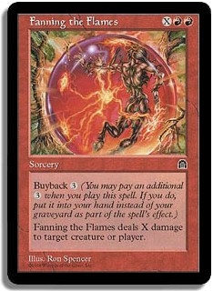 Buyback <3>. Fanning the Flames deals X damage to target creature or player.
