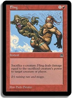 <Sacrifice a creature>: Fling deals damage equal to the sacrificed creature's power to target creature or player.