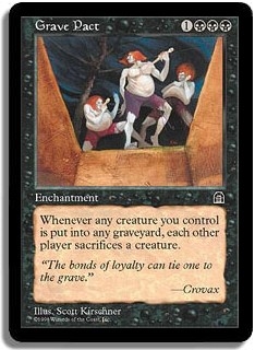 Whenever any creature you control is put into any graveyard, each other player sacrifices a creature.
