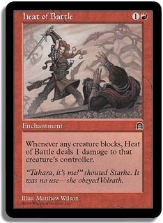 Whenever any creature blocks, Heat of Battle deals 1 damage to that creature's controller.
