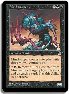Mindwarper comes into play with three +1/+1 counters on it. <2B, Remove a +1/+1 counter from Mindwarper>: Target player chooses and discards a card. Play this ability as a sorcery.