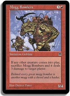 If any other creature comes into play, sacrifice Mogg Bombers and it deals 3 damage to target player.