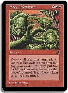 Destroy all creatures target player controls. For each creature put into any graveyard in this way, put two Goblin tokens into play under that player's control. Treat these tokens as 1/1 red creatures.