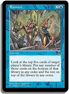 Look at the top five cards of target player's library. Put any number of those cards on the bottom of that player's library in any order and the rest on top of the player's library in any order.