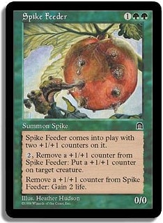 Spike Feeder comes into play with two +1/+1 counters on it. <2, Remove a +1/+1 counter from Spike Feeder>: Put a +1/+1 counter on target creature. <Remove a +1/+1 counter from Spike Feeder>: Gain 2 life.