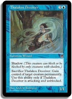 Shadow. <Sacrifice Thalakos Deceiver>: Gain control of target creature permanently. Use this ability only if Thalakos Deceiver is attacking and unblocked.