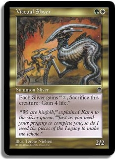 "We are kinfolk," explained Karn to the sliver queen. "Just as you need your progeny to complete you, so do I need the pieces of the Legacy to make me whole."