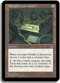 When you play Volrath's Laboratory, choose a color and creature type. <5,T>: Put a token creature into play. Treat this token as a 2/2 creature of the chosen color and creature type.