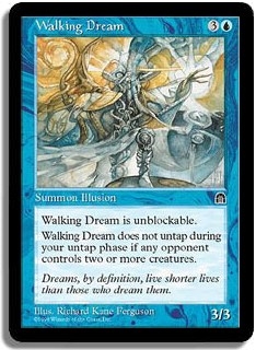 Walking Dream is unblockable. Walking Dream does not untap during your untap phase if any opponent controls two or more creatures.