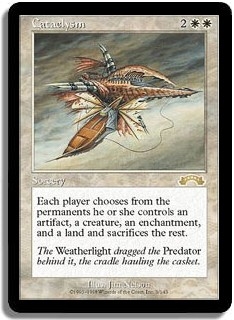 Each player chooses an artifact, creature, enchantment and land he or she controls. Sacrifice the rest.