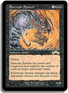 Flying. Entropic Specter has power and toughness equal to the number of cards in target opponent's hand. If Entropic Specter damages any player, that player chooses and discards a card.
