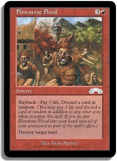 Buyback - 3 life, Discard a card at random. Destroy target land.