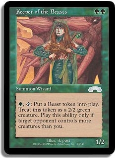 <G,T>: Put a Beast token into play. Treat this token as a 2/2 green creature. Play this ability only if target opponent controls more creatures than you.