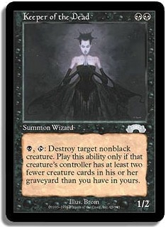 <B,T>: Destroy target nonblack creature. Play this ability only if that creature's controller has at least two fewer cards in his or her graveyard than you have in yours.