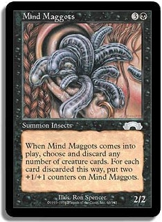 When Mind Maggots comes into play, you may choose and discard any number of creature cards. For each card discarded this way, put two +1/+1 counters on Mind Maggots.