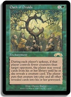 During each player's upkeep, if that player controls fewer creatures than target opponent, he or she may reveal cards from his or her library until he or she reveals a creature card. The player puts that creature into play and all other revealed cards into his or her graveyard.