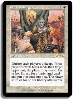 During each player's upkeep, if that player control less lands than target opponent, that player may search his or her library for a basic land and put it into play. Shuffle his or her library afterwards.