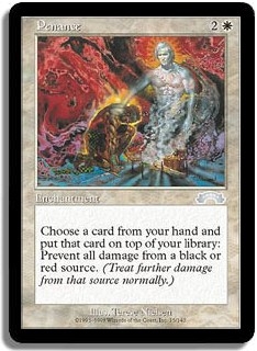 Discard a card to the top of your library: Prevent all damage from a red or black source to a creature or player.